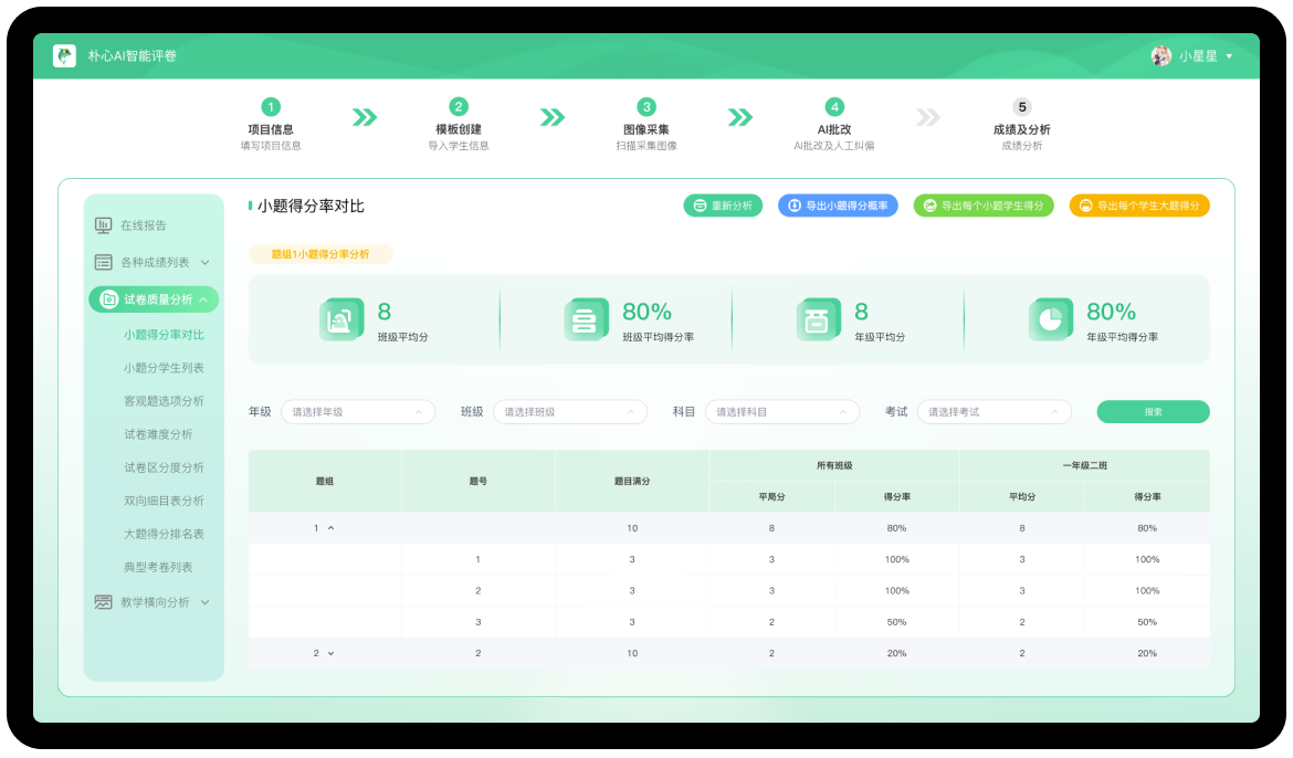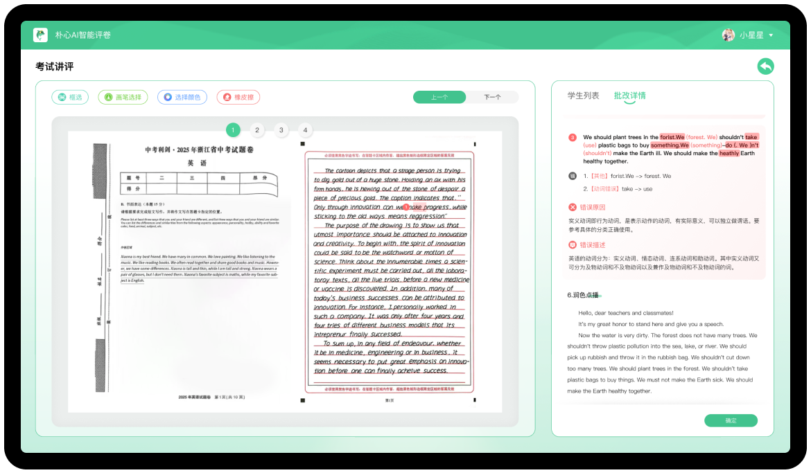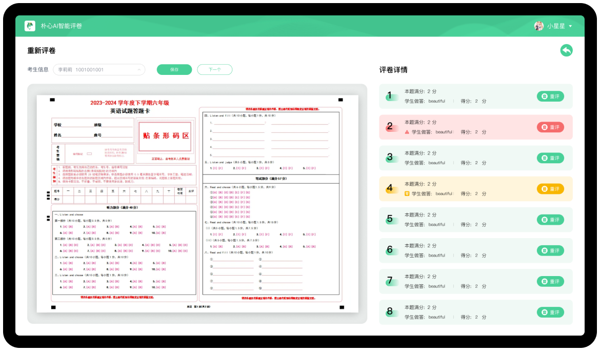 Pu Xin AI intelligent marking system is an automated marking solution built on artificial intelligence technology in the field of education. Its core functions revolve around efficiency, accuracy, and fairness, and it optimizes teaching processes through multi-dimensional data feedback.